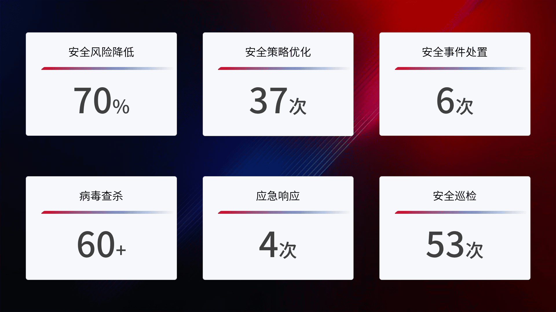 提供全面的安全事件报告体系,,,包括处置报告、、、、周报、、、、季度和年度总结,,,结合持续监控,,帮助客户深入了解网络安全状况。。